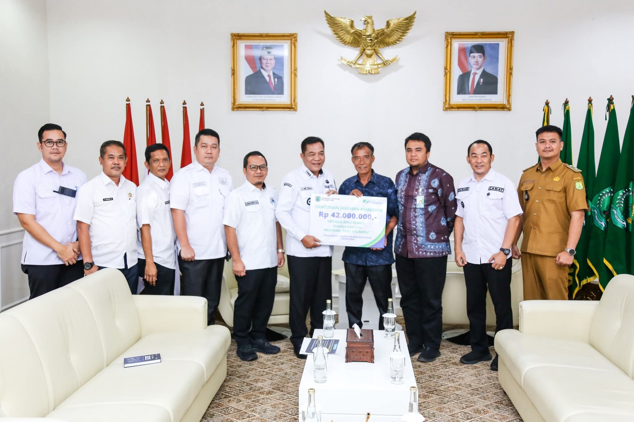 Musi Banyuasin,- Bupati Kabupaten Musi Banyuasin H M Toha bersama BPJS Ketenagakerjaan Muba serahkan santunan jaminan kematian kepada ahli waris pekerja rentan program pake kelambu. Santunan kematian yang diberikan ini sebesar Rp 42 juta kepada ahli waris Almarhumah Nurhasana, Rabu (28/5/2025) bertempat di Kantor Bupati.