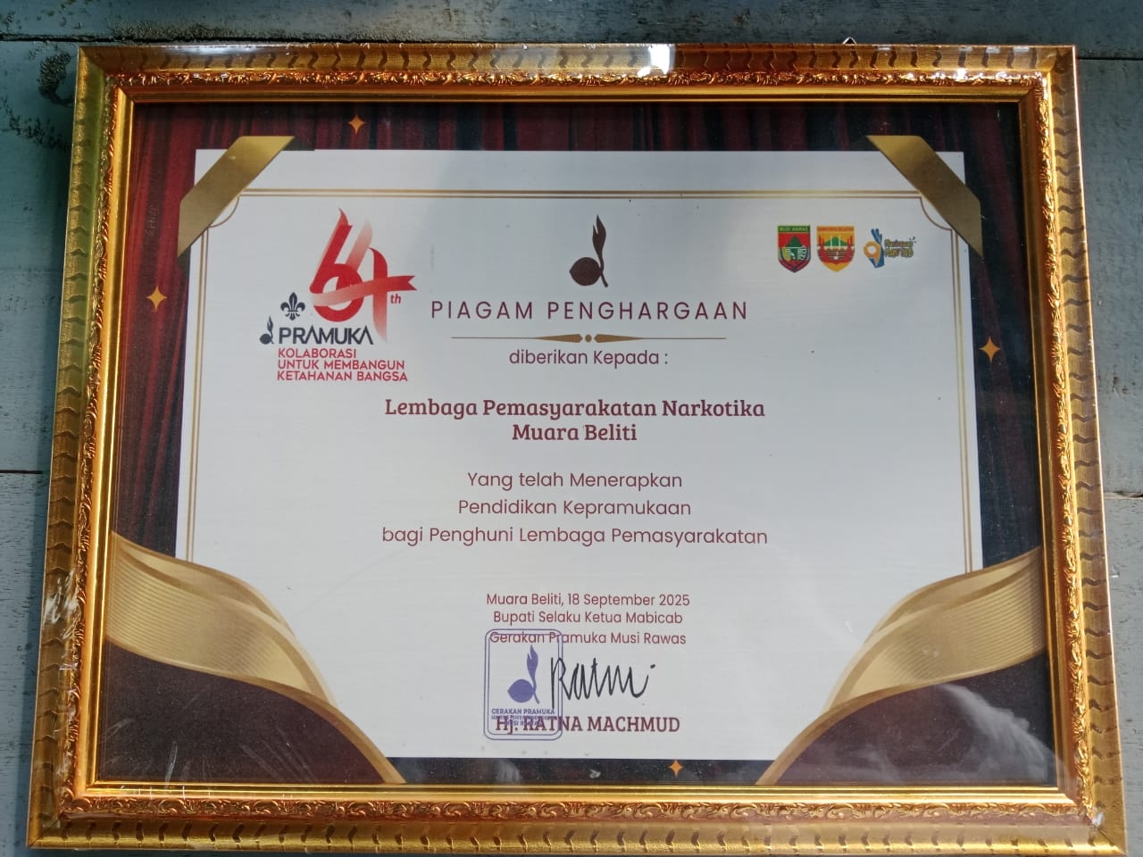 Muara Beliti, kabarsumsel.com – 18 September 2025* — Lembaga Pemasyarakatan (Lapas) Narkotika Kelas IIA Muara Beliti kembali menorehkan prestasi membanggakan di bidang pembinaan narapidana. Dalam peringatan Hari Pramuka ke-64 yang digelar di **Lapangan Beregam, Muara Beliti**, Lapas ini menerima penghargaan atas komitmennya dalam menyelenggarakan pendidikan kepramukaan bagi warga binaan pemasyarakatan (WBP).